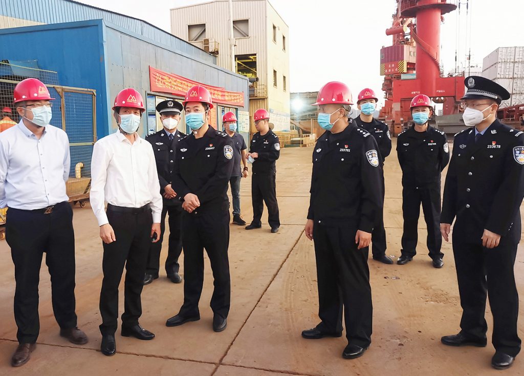 在青拓物流12#13#14#泊位,章东龙汇报了泊位分布位置及吞吐量等情况,谢继宏对物流外贸作业点作业情况及边检执勤情况进行详细调研,并作出相应工作指导。谢继宏对青拓各项工作部署及成果给予肯定,他强调:在当前疫情防控关键期,青拓须不惧风高浪急,再接再厉,做好与口岸相关部门的对接与业务沟通工作,交出口岸开放场所监管工作的满意答卷,与边检卫士们共同守卫国门安全。